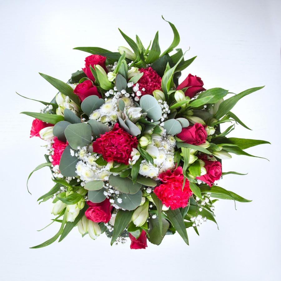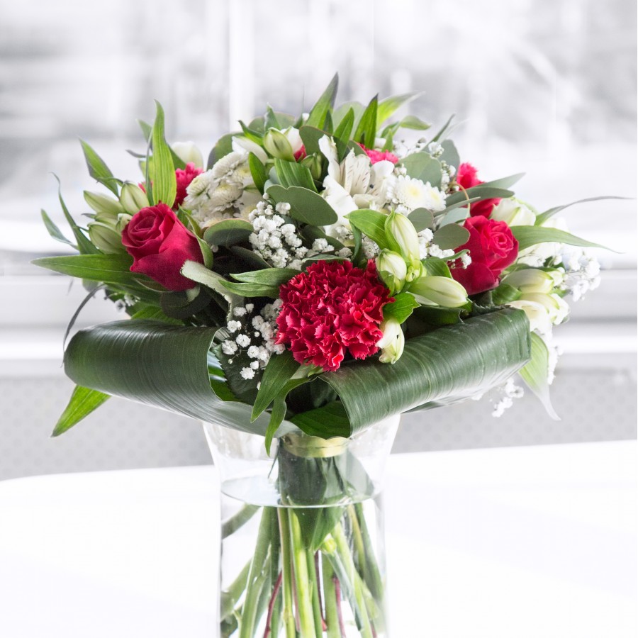 Experience the refined beauty of our Pure Elegance Flower Arrangement. This bouquet features a harmonious blend of red roses, elegant white chrysanthemums, and airy gypsophila, complemented by white alstroemeria and rich aspidistra leaves.